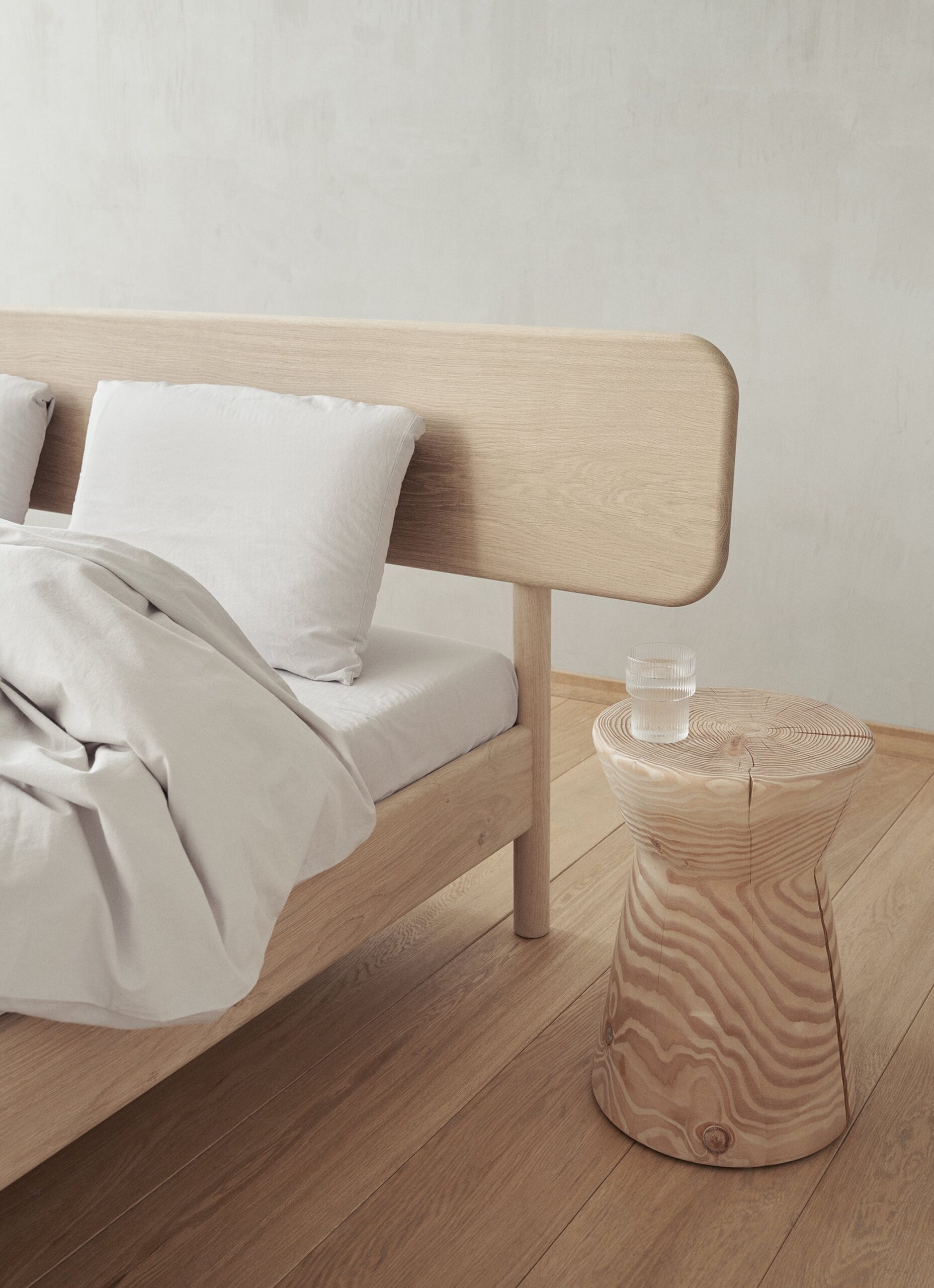 The Alken Bed Frame is a prize-winning design by Oliver & Lukas WeissKrogh, characterized by a distinctly timeless silhouette, and conceived as a tribute to sleep. The bed is made solely from solid oak, with each piece of wood going into the creation of the bed being unglued, thus preserving the well-defined grain of the oak tree. The unbroken patterns are notably highlighted in the elevated headboard, creating a meditative presence within the bedroom.