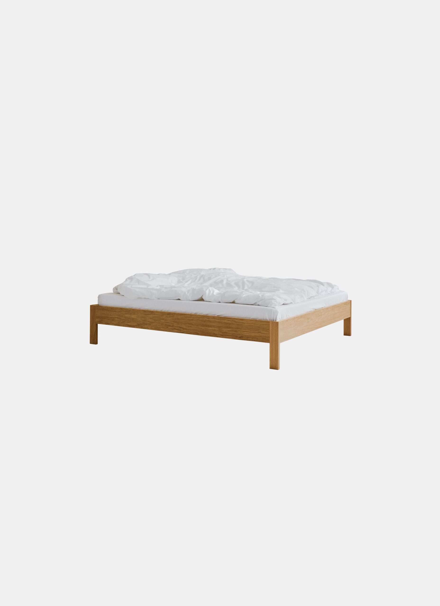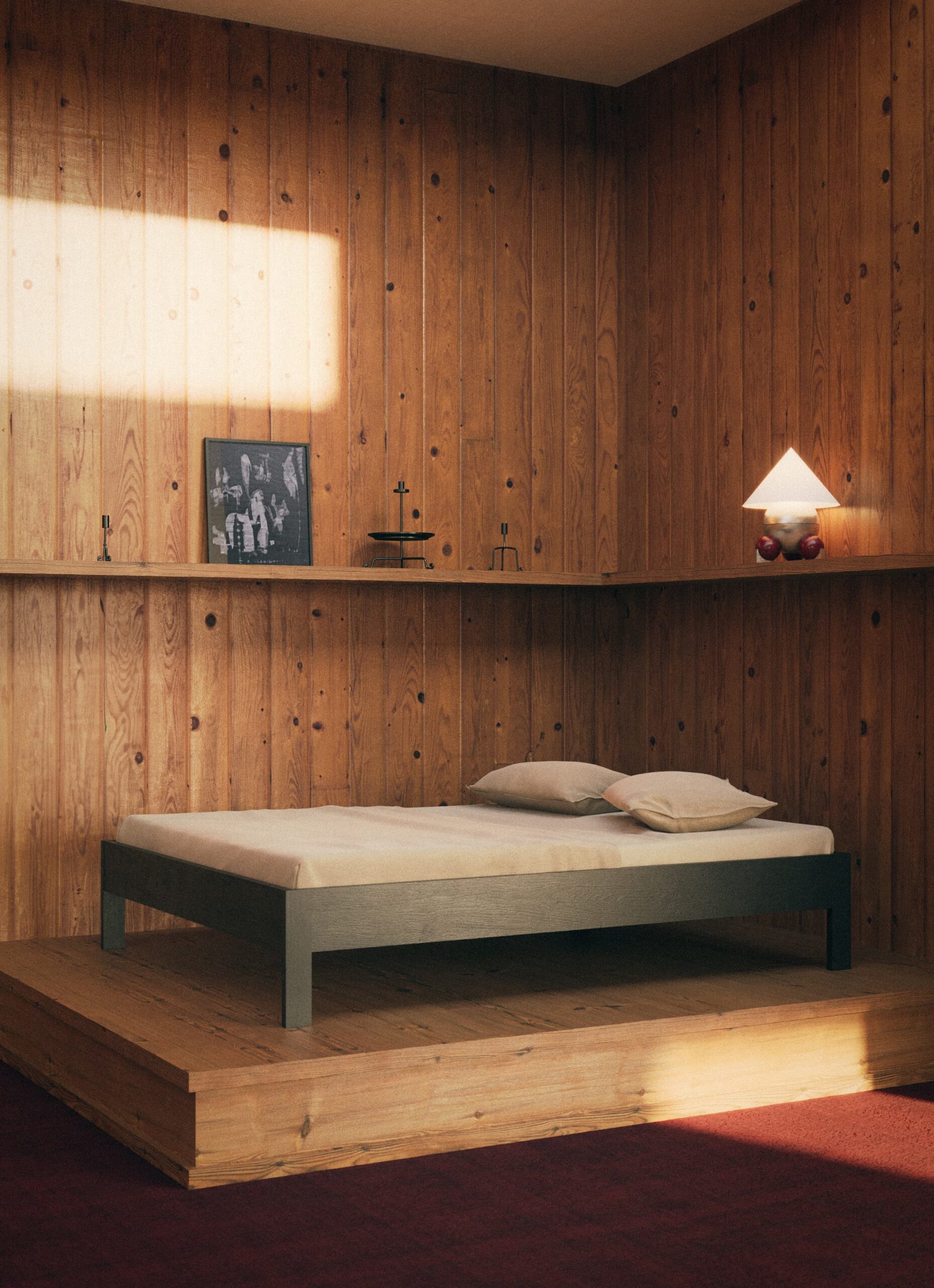 Ejer ex Headboard Bed Frame explores a deeply ascetic principle – the conscious renunciation of excess functionality. Stripped to the bare essentials, a simple combination of a low horizontal profile with a vertical leg structure emerges to define an archetypical figure of a carried frame.